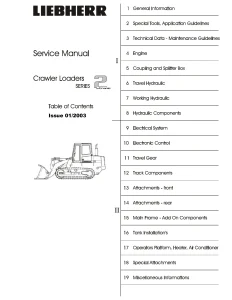 Instant download Liebherr Crawler Loader Series 2 Litronic tm1946 Service Manual! MODELS COVERED IN MANUAL Liebherr Crawler Loader Series 2 Litronic tm1946 Service Manual CHAPTERS COVERD IN MANUAL *1 General Information *2 Special Tools, Application Guidelines *3 Technical Data-Maintenance Guidelines *4Engine *5 Coupling and Splitter Box *6 Travel Hydraulic *7 Working Hydraulic *8 Hydraulic Components…