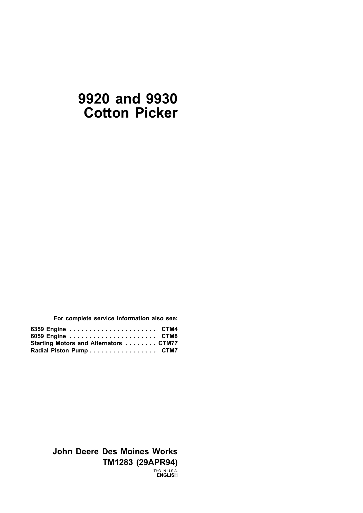 John Deere Cotton Picker 9920 9930 TM1283 Technical Manual EN PDF