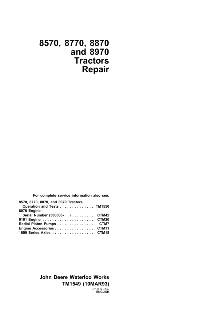 Instant download John Deere Tractors 8570 8770 8870 8970 Repair Manual!