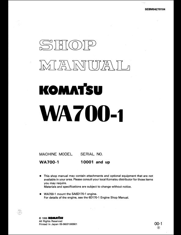 Instant download Komatsu Wheel Loaders WA700-1 Service Repair Workshop Manual. This manual content all service, repair, maintenance, troubleshooting procedures for KOMATSU Machine.