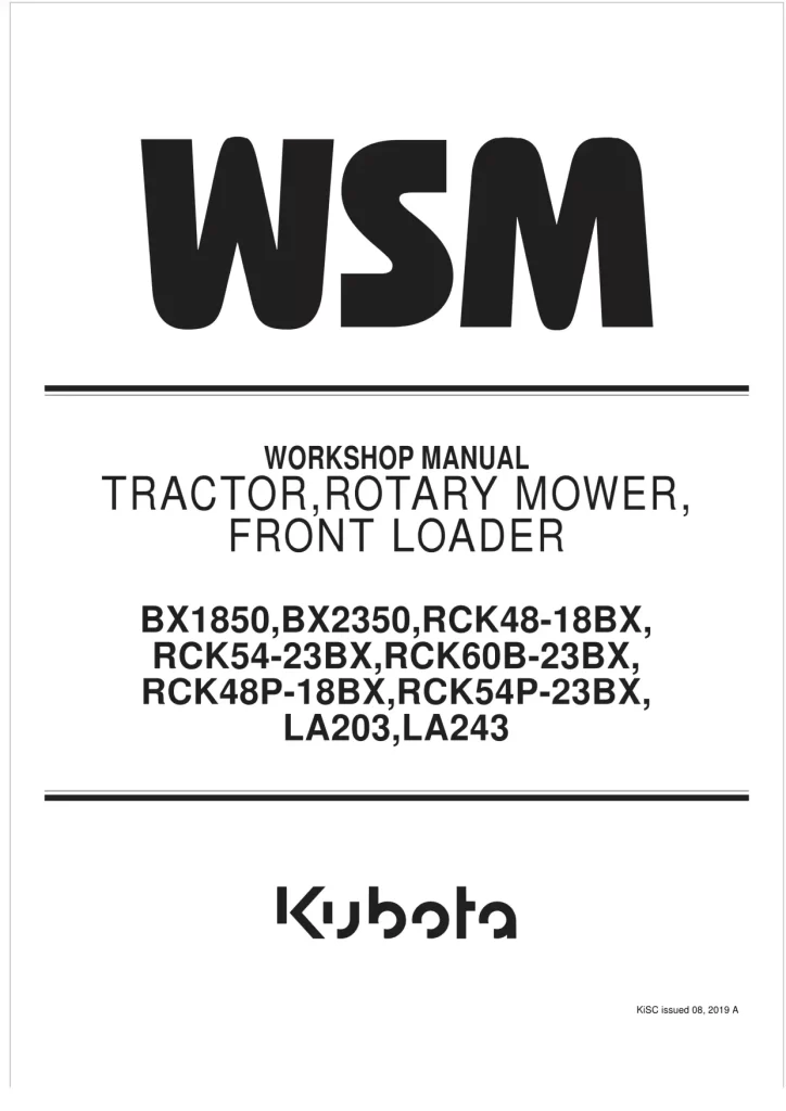 Instant download Kubota BX1850 BX2250 RCK48 RCK54 RCK60 LA203 LA243 Service Manual! A downloadable repair manual, also termed factory service manual, is a book of repair instructions that describes the maintenance, service and repair procedures for the complete vehicle. Its a digitally delivered repair book that covers all aspects of repair.