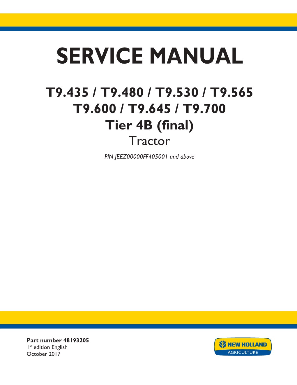 New Holland T9.435/T9.480/T9.530/T9.565/T9.600/T9.645/T9.700 Tier 4B (final) Tractor Service Repair Manual