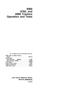 Instant download John Deere Articulated Tractors 8560 8760 8960 4WD Repair Manual! MODELS COVERED IN MANUAL John Deere Articulated Tractors 8560 8760 8960 4WD Repair Manual TM1433 CHAPTERS COVERD IN MANUAL *SECTION 05-SAFETY *Group 05-Safety *SECTION 10-GENERAL INFORMATION *Group 05—Machine Specifications *Group 10-Predelivery *Group 15-Tune-up *Group 20—Lubrication *SECTION 15-Component Removal *Group 00—Major Components *Group 05-Front…