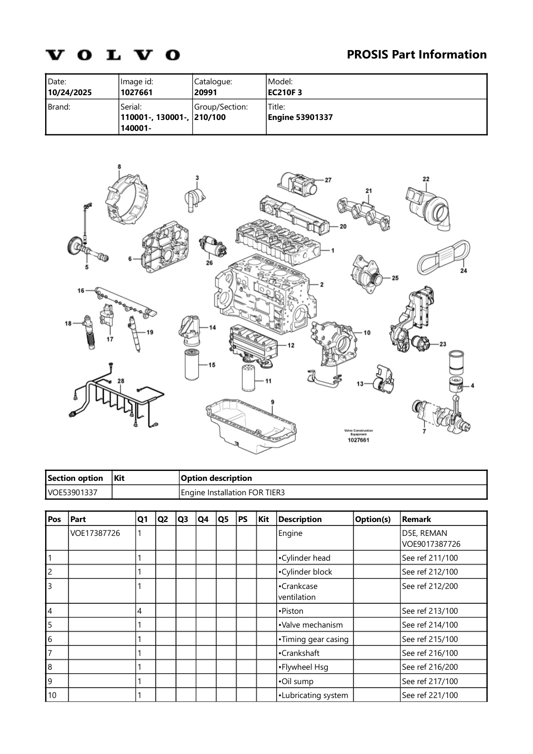 Volvo EC210F 3 Excavators Part Manual